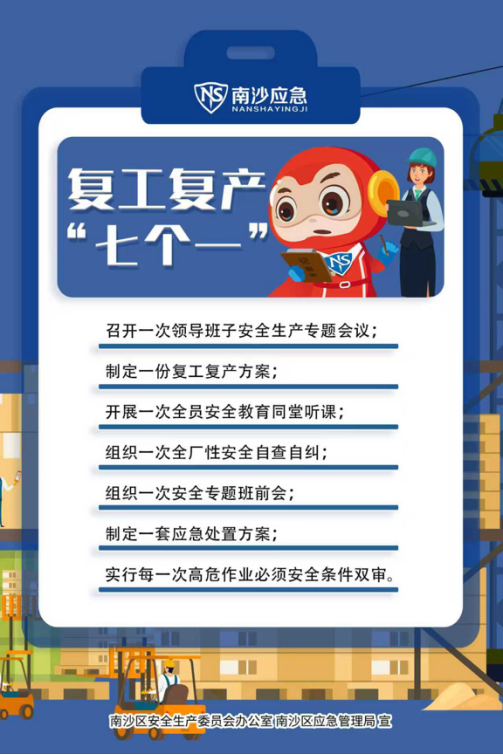春节假期已参加尾声,各分娩运筹帷幄单元逐渐规复泛泛分娩程序,南沙街谈在此温馨提醒:请各单元在规复分娩前,对照以下复工复产“七个一”条目,落实各项安全准备服务,确保节后安全复工、吉祥复产。